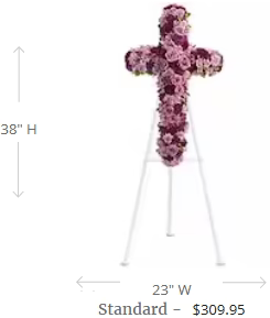 Beautiful flowers such as lavender roses, carnations and cushion spray chrysanthemums along with fuchsia and purple carnations and button spray chrysanthemums create a dazzling cross that is full of hope and devotion.