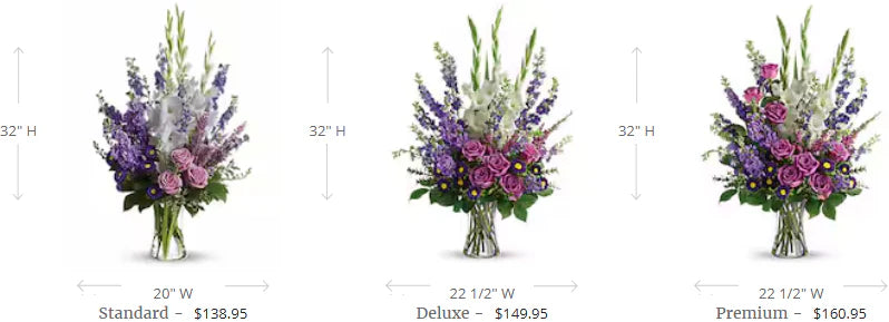 A classic assortment of flowers such as lavender larkspur, stock and roses, plus purple asters, white gladioli and pink heather.